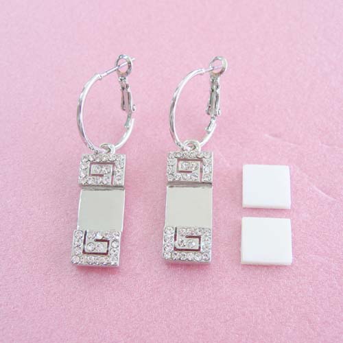 * 3단큐빅사각귀걸이* 화이트명판 2개포함, 큐빅이 고급스럽게 디자인되어 있습니다.* 귀걸이 규격 (고리부분제외) : 가로 10mm, 세로 23mm 명판규격 : 가로,세로 9mm